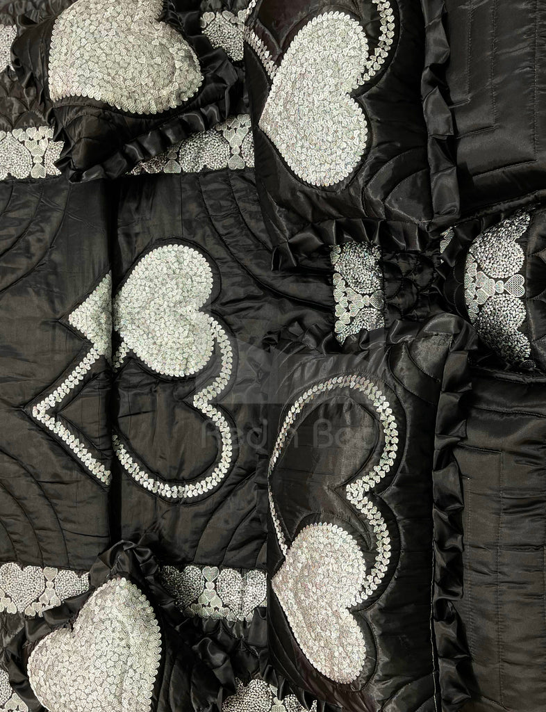 Gold Clock Designs Bridal Set is to blend elegance, comfort, and durability. This embroidered bridal set includes 11 premium pieces: a quilted bedsheet with frill, four quilted pillow cases, two cushion covers, two neck roll cases, and a charming quilted heart shape case. The set also features a cozy razai with 200 GSM fiber filling and a practical back zipper for easy use. Made with malai cotton fabric on the back, it delivers softness and breathability, while the heavy and shiny embroidery adds a timeless, regal touch. Packaged in a sturdy wire bag and weighing 8–9 kg, this luxury bridal bedding from REDNBED is a complete solution for brides seeking style, comfort, and lasting quality in their home textiles collection.