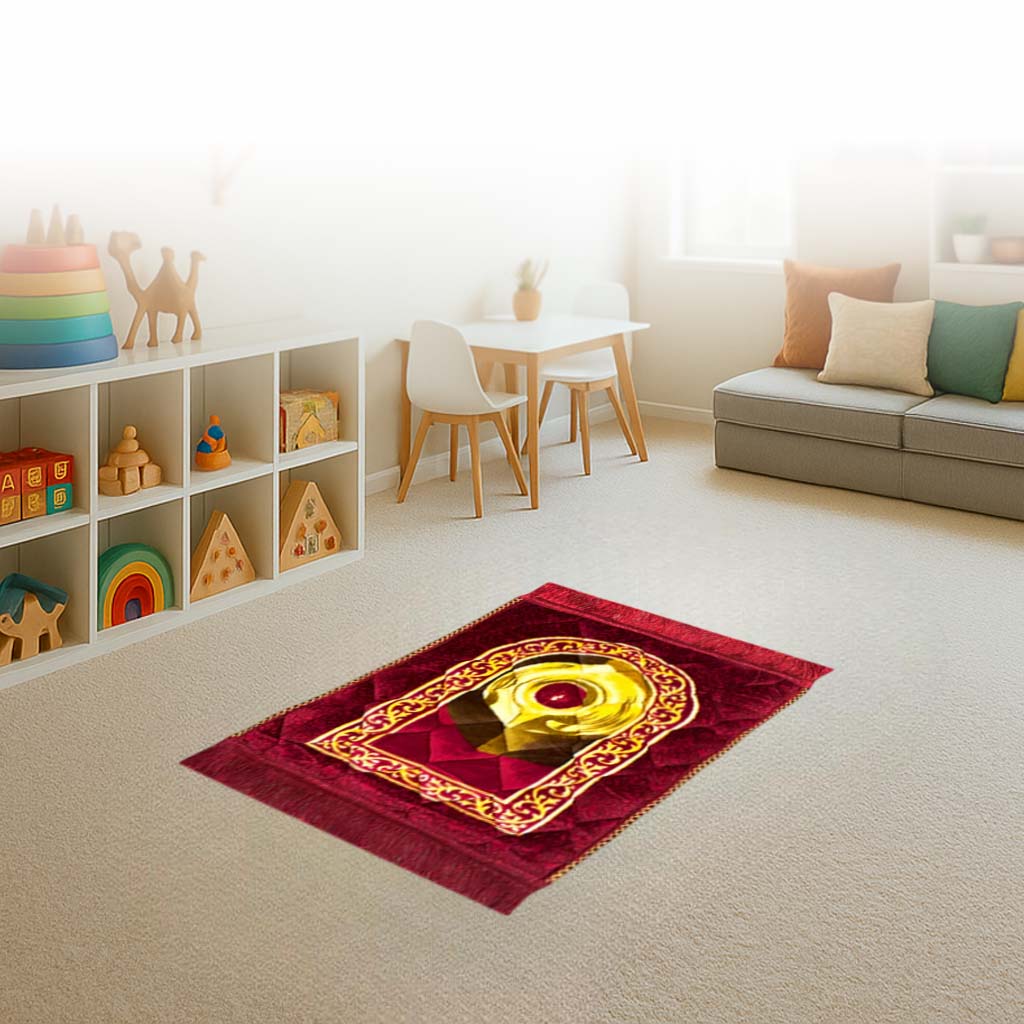 Our kids prayer mat is made with soft velvet fabric and gentle padding that feels cozy under little feet. With a size of 42 × 60 cm, 1-inch thickness, and weighing just 400 g, it’s lightweight, foldable, and easy to carry and perfect for daily use or travel. Each mat is finished with high-quality lace and piping, a waterproof back, and natural soft filling made from wool and cotton blends. This premium prayer mat Pakistan design not only looks beautiful with its shiny surface but also lasts with durable stitching. If you’re searching to buy prayer mat online Karachi, this soft padded kids prayer rug makes a thoughtful gift and a comfortable choice for young learners.