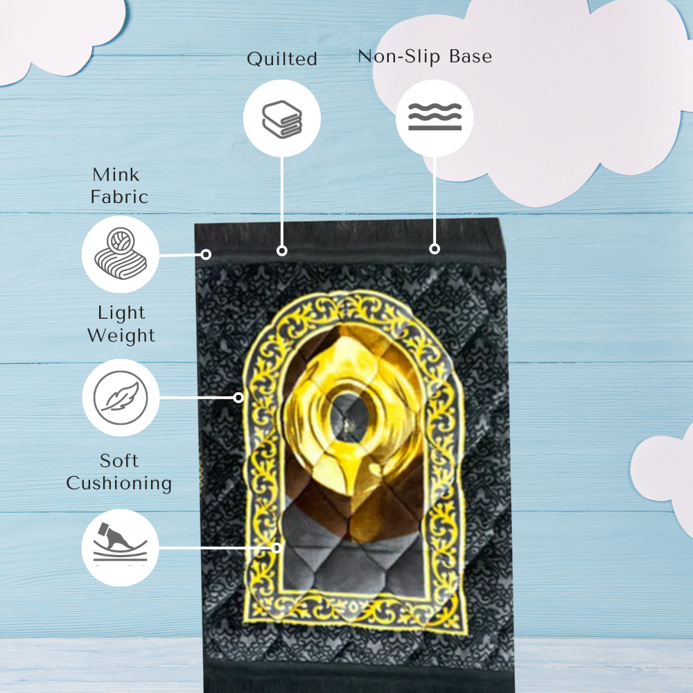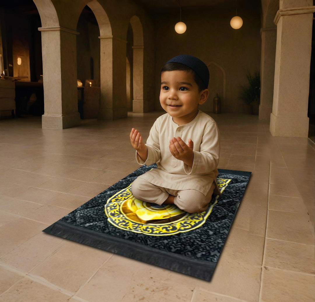 Our kids prayer mat is made with soft velvet fabric and gentle padding that feels cozy under little feet. With a size of 42 × 60 cm, 1-inch thickness, and weighing just 400 g, it’s lightweight, foldable, and easy to carry and perfect for daily use or travel. Each mat is finished with high-quality lace and piping, a waterproof back, and natural soft filling made from wool and cotton blends. This premium prayer mat Pakistan design not only looks beautiful with its shiny surface but also lasts with durable stitching. If you’re searching to buy prayer mat online Karachi, this soft padded kids prayer rug makes a thoughtful gift and a comfortable choice for young learners.